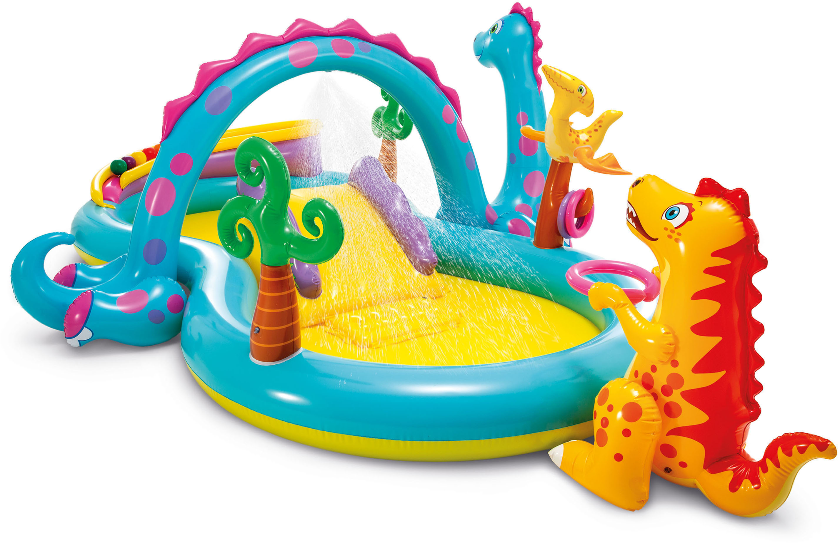 Μετατρέψτε τον κήπο σας σε ένα δικό σας μικρό water park με το Intex Dinoland Play Center. Τα παιδιά σας θα μπορούν να έχουν πολλές ώρες «δροσερού» παιχνιδιού, με αυτό το «προϊστορικό» πάρκο με τα 4 διαφορετικά παιχνίδια. Με την νεροτσουλίθρα θα μπορούν να γλιστρήσουν ομαλά και να βουτήξουν στο νερό ή να βάλουν καλάθι στον εύσωμο αλλά γλυκό και καλοσυνάτο δεινόσαυρό, ή να βάλουν τα δαχτυλίδια στην μύτη του άκακου πτεροδάκτυλου ή να σπρώχνουν τα 6 πολύχρωμα μπαλάκια στην ειδική πλατφόρμα. Συνδέστε το λάστιχο, και το πιτσιλιστίρι θα κρατάει δροσερούς τους μικρούς μας ήρωες! Σίγουρα θα γίνει το αγαπημένο παιχνίδι των παιδιών το καλοκαίρι. Υπάρχει προστατευτικό μαξιλάρι στο τέλος της τσουλίθρας για μέγιστη προστασία.