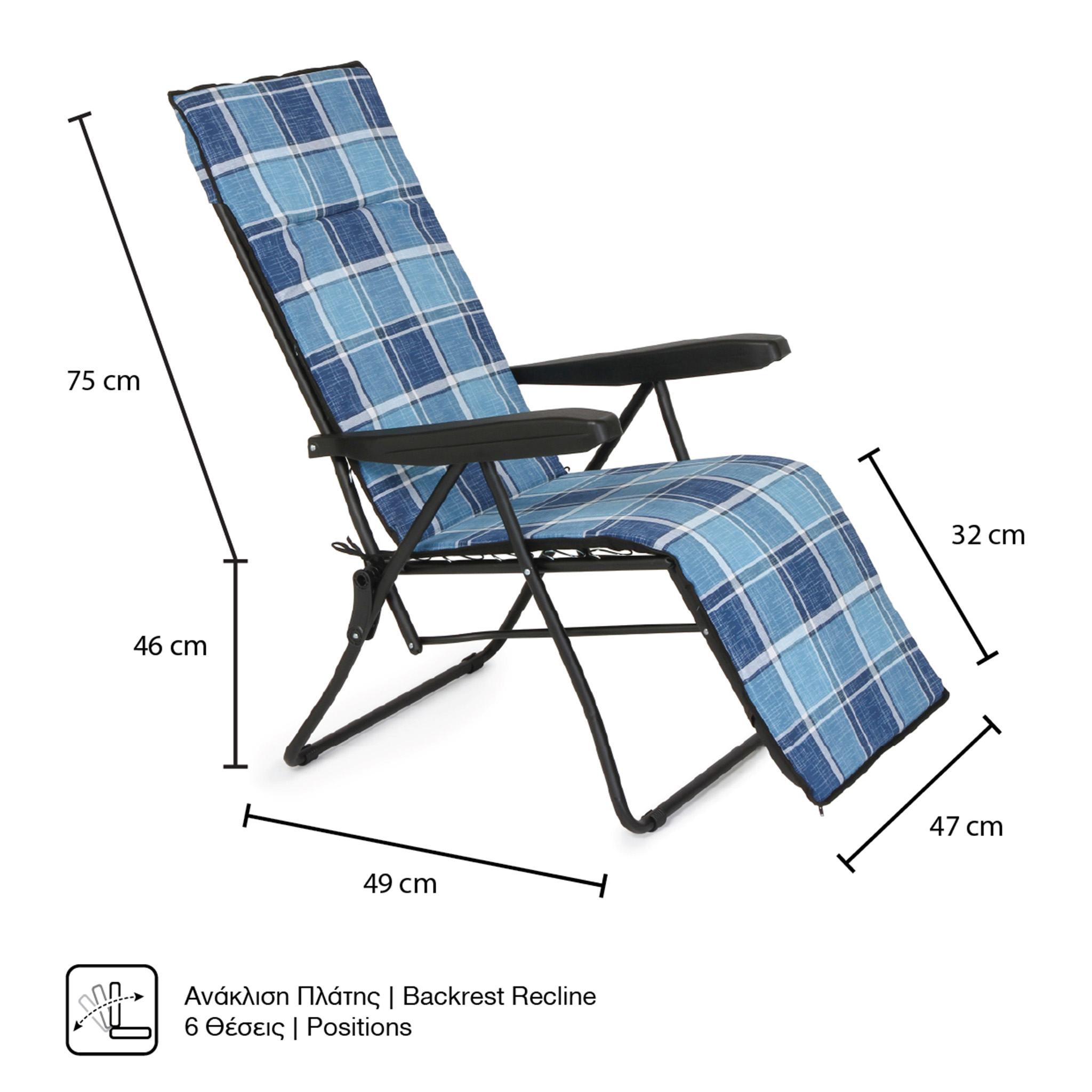 Συμπεριλαμβάνει μαλακό μαξιλάρι 1,7 εκατοστών από Polycotton. Η πολυθρόνα είναι κατασκευασμένη με στρόγγυλο σκελετό 20 χιλιοστών ιδιαίτερης αντοχής ενώ τα μπράτσα του είναι πλαστικά. Ευρωπαϊκής κατασκευής (Ιταλία)