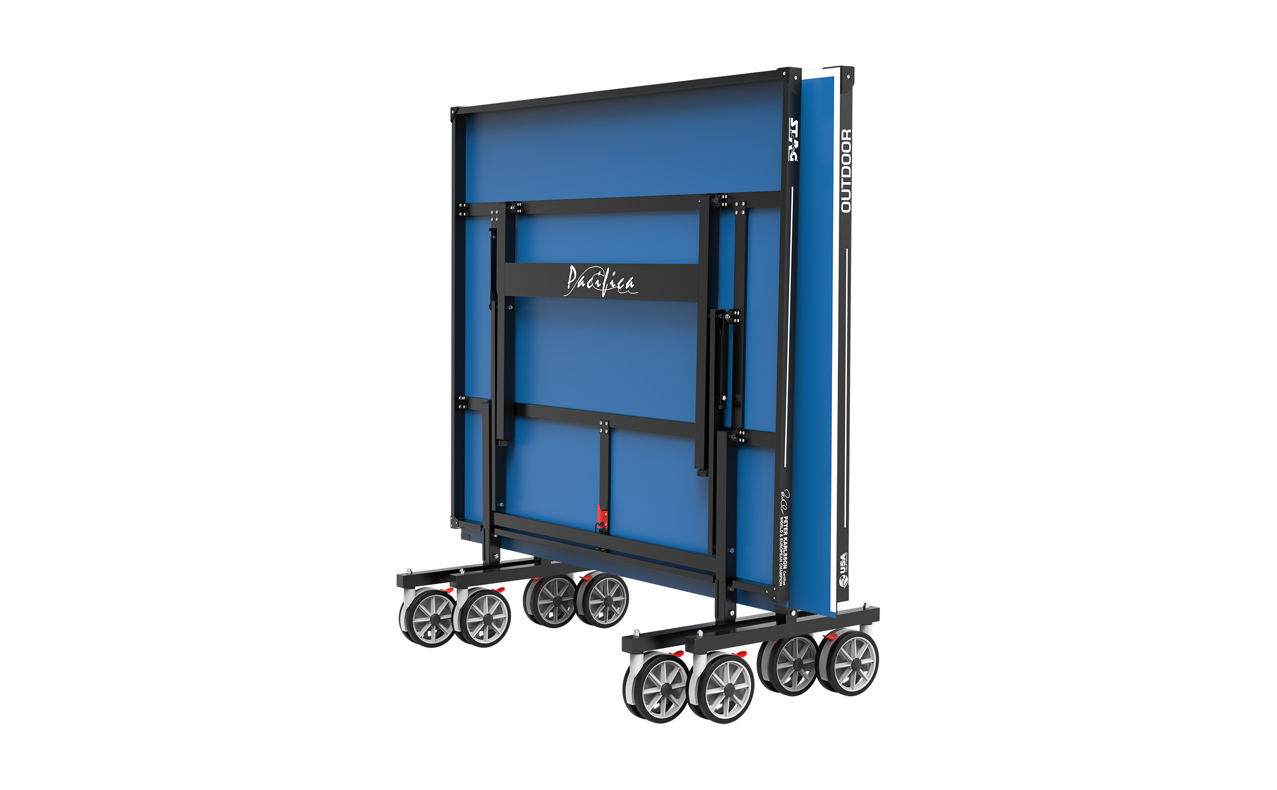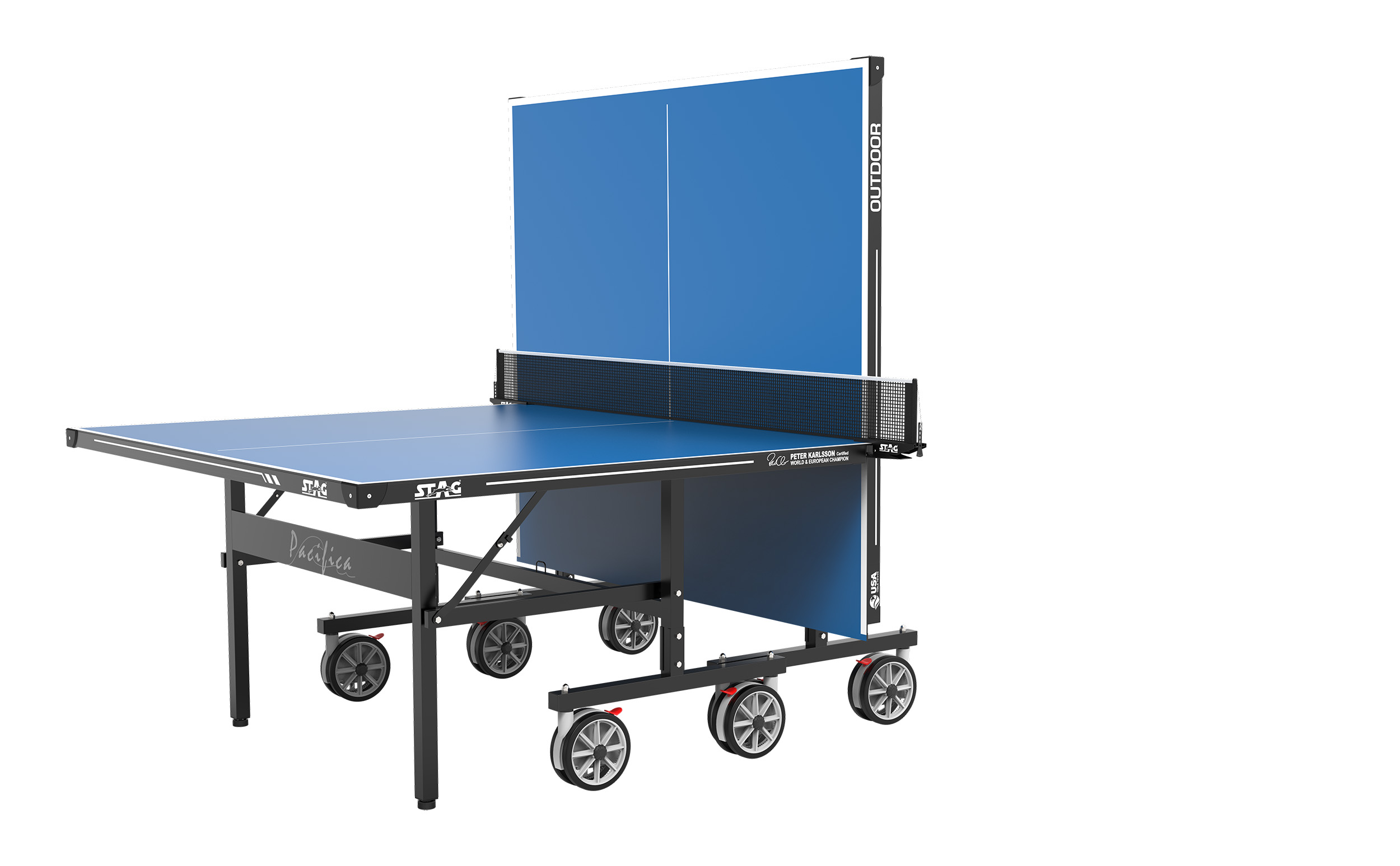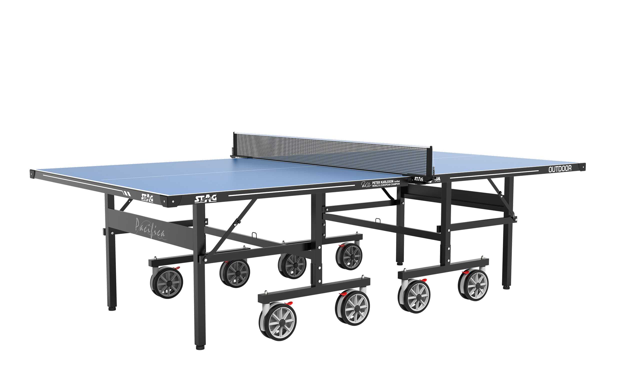 Το τραπέζι εξωτερικού χώρου Pacifica από την Stag, είναι ιδανικό για παιχνίδι μεταξύ μελών της οικογένειας, φίλων ή ακόμα και πιο έμπειρων παικτών. Τα πόδια του, με τη δυνατότητα ρύθμισης του ύψους, και τα δυνατά του φρένα διασφαλίζουν την σταθερότητά του, ακόμη και σε κήπους με ανώμαλο έδαφος. Με τους 4 μεγάλους διπλούς τροχούς σε κάθε φύλλο, μπορεί να μετακινηθεί εύκολα πηγαίνοντας σε μέρη που θα ήταν αδύνατο με τα άλλα τραπέζια.